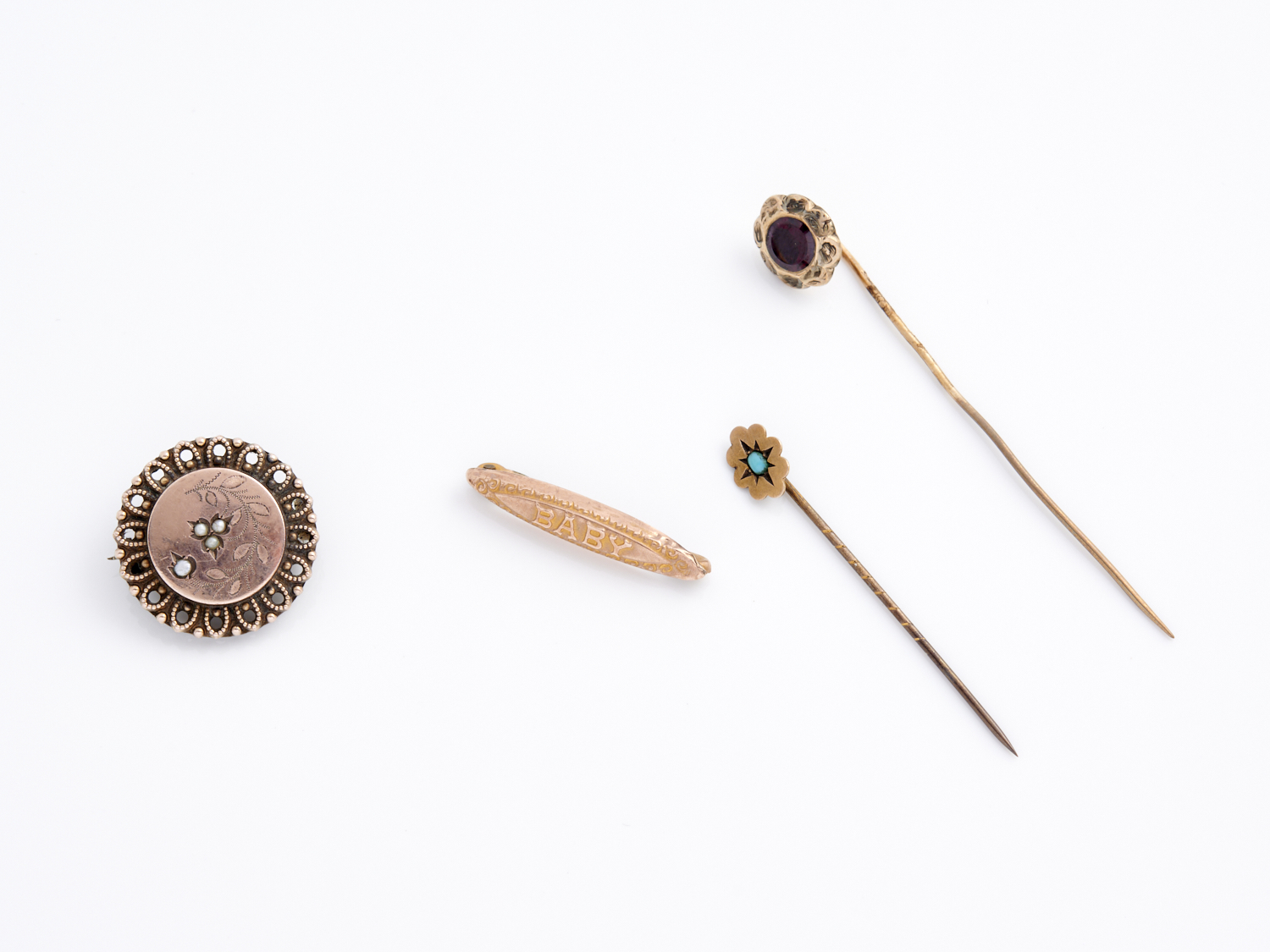 TWO ANTIQUE STICK PINS, INCLUDING ONE GARNET SET IN 9CT GOLD, TOGETHER WITH TWO ANTIQUE BROOCHES, THE 'BABY' BROOCH IN 9CT GOLD