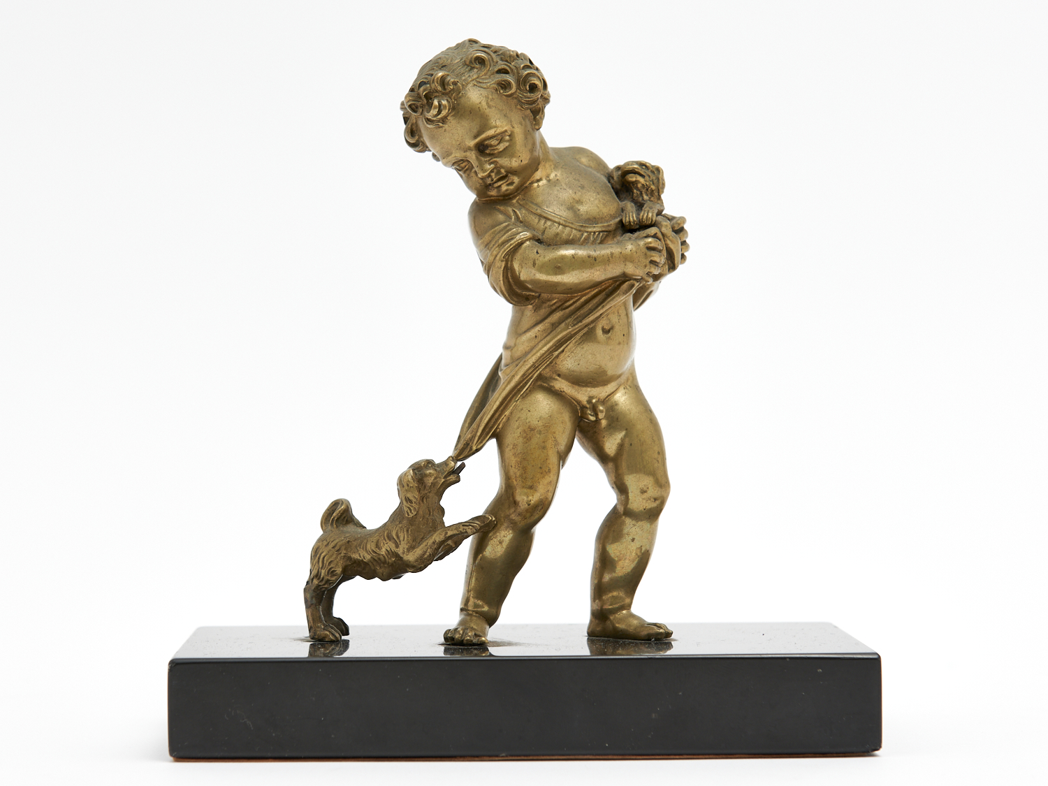 A 19TH CENTURY BRONZE FIGURE OF PUTTO AND TWO DOGS, ON MARBLE BASE H.17CM, LEONARD JOEL DELIVERY SIZE: SMALL