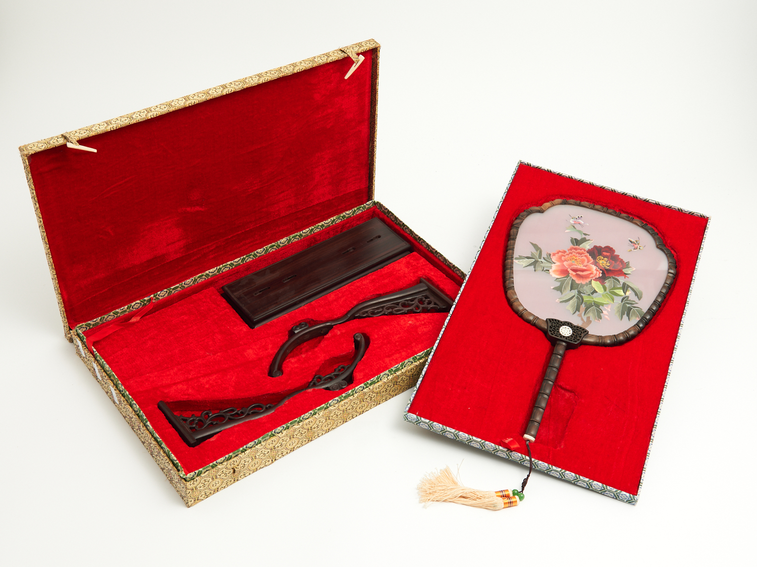 A CARVED WOODEN AND EMBROIDERED CHINESE FAN WITH STAND IN ORIGINAL CASE W.45CM, LEONARD JOEL LOCAL DELIVERY: MEDIUM