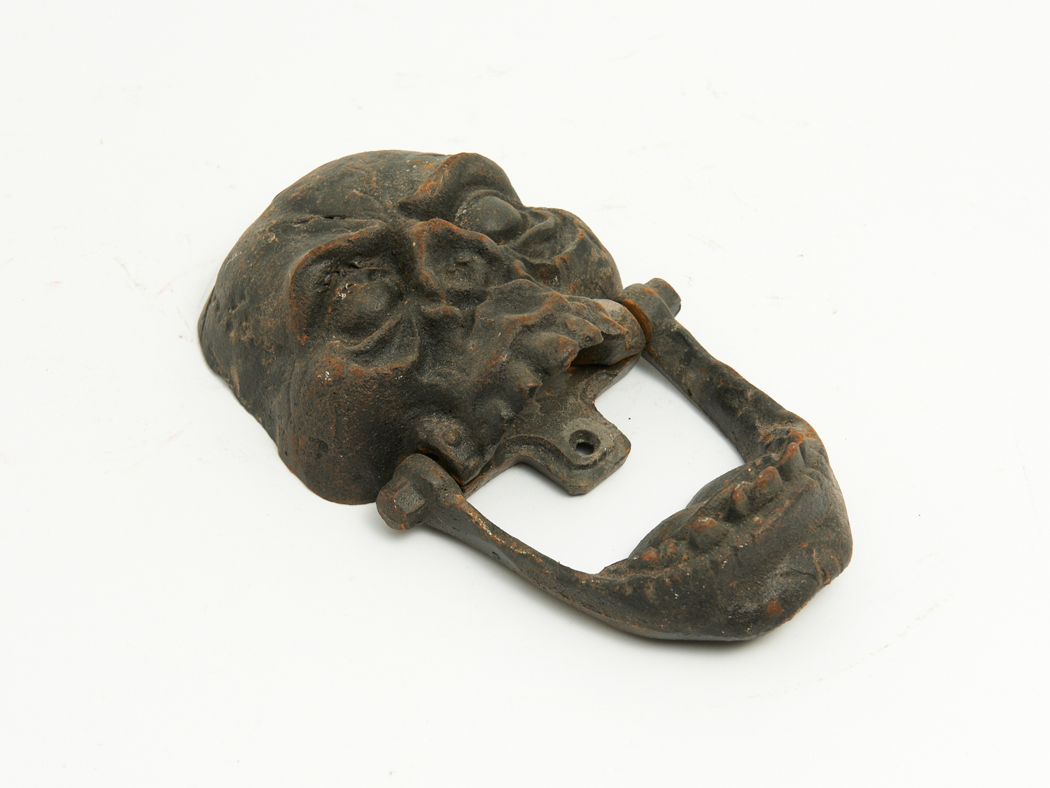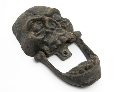 A VINTAGE CAST IRON SKULL-FORM DOOR KNOCKER H.24CM, LEONARD JOEL LOCAL DELIVERY: SMALL