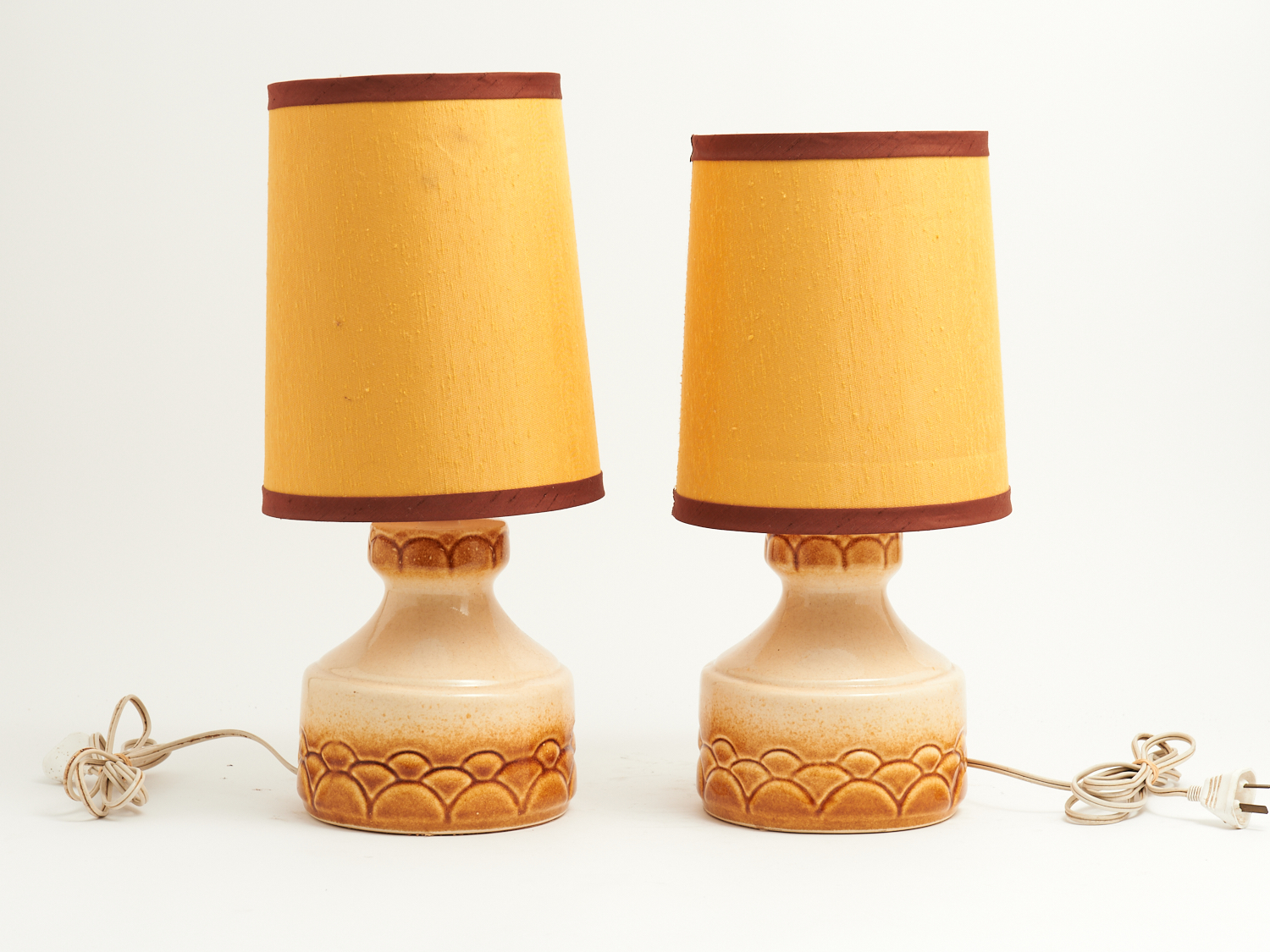 A PAIR OF AUSTRALIAN POTTERY ELLIS LAMPS WITH ORIGINAL MATERIAL SHADES H.45.5CM (TALLEST), LEONARD JOEL LOCAL DELIVERY: MEDIUM