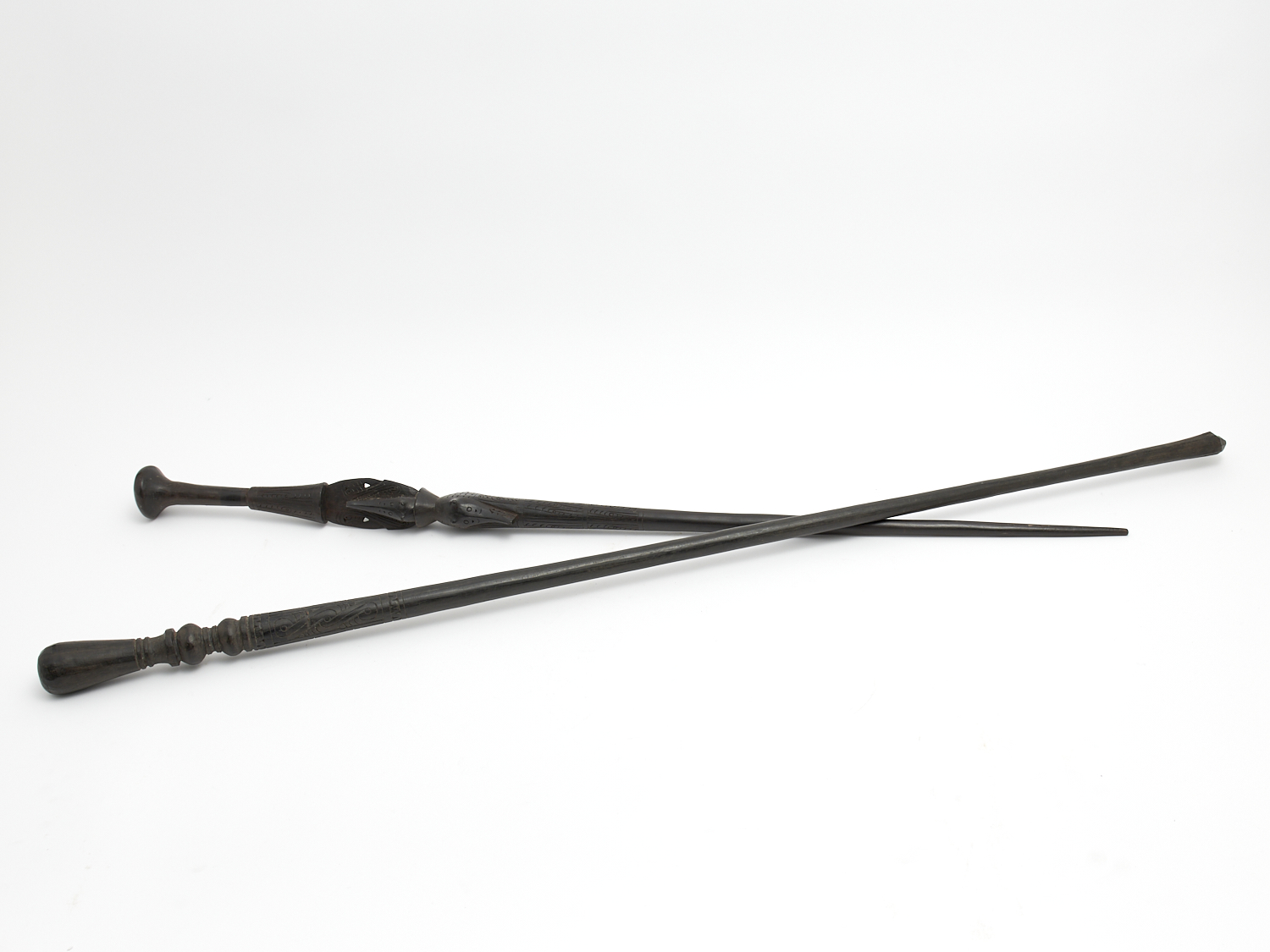 TWO CARVED ISLANDER TRIBAL ROSEWOOD WALKINGSTICKS / STAFFS L.101CM (TALLEST), LEONARD JOEL LOCAL DELIVERY: SMALL
