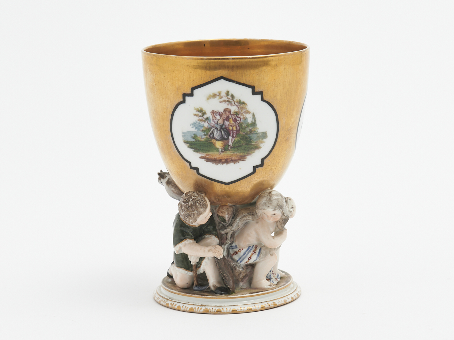 A KPM PORCELAIN FIGURAL GOBLET, WITH GILDED AND PAINTED DECORATION, 13CM HIGH, LEONARD JOEL DELIVERY SIZE: SMALL