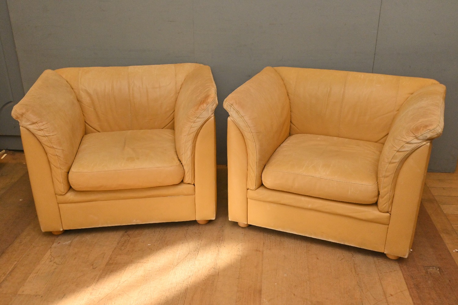 A PAIR OF VATNE MOBLER LEATHER ARMCHAIRS (73H X 100W X 80D CM) (PLEASE NOTE THIS HEAVY ITEM MUST BE REMOVED BY CARRIERS AT THE CUSTOMER'S EXPENSE. LEONARD JOEL STAFF CANNOT ASSIST CARRYING THIS ITEM) (LARGE ITEM)