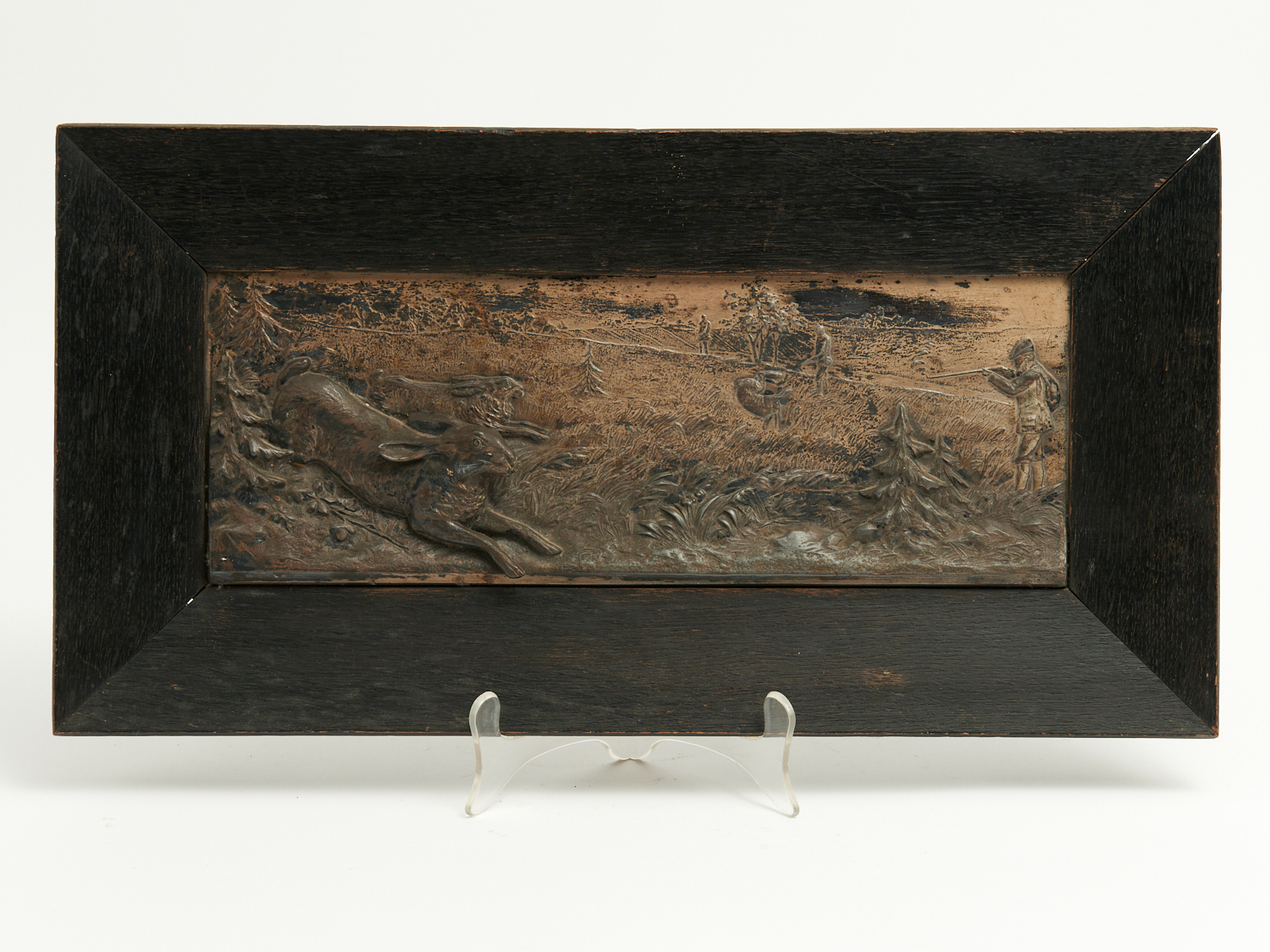 AN OAK FRAMED EDWARDIAN SILVERED PEWTER RELIEF HUNTING SCENE 24 X 46CM, LEONARD JOEL DELIVERY SIZE: SMALL