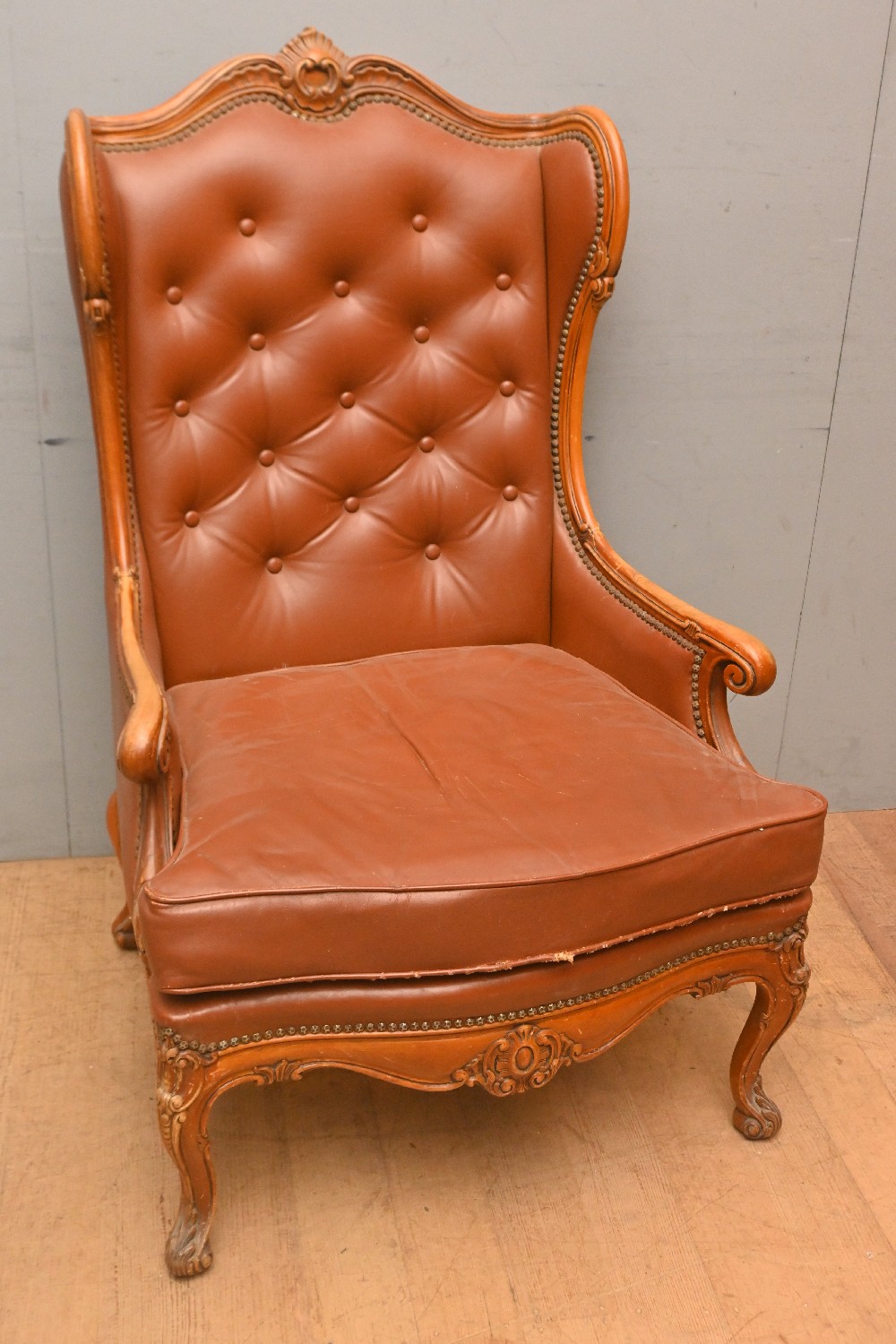 A LOUIS XV-STYLE HARDWOOD AND UPHOLSTERED WING BERGERE, IN BUTTONED TAN LEATHER (117H X 73W X 82D CM) (LEONARD JOEL DELIVERY SIZE: X-LARGE)