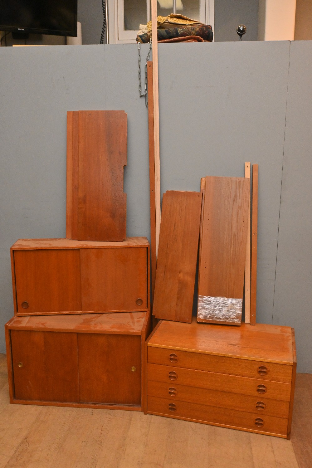 A COLLECTION OF DANISH FLOATING SHELVES - MISSING BRACKETS (A/F) (LARGEST CABINET 50H X 80W X 45D CM) (LARGEST SUPPORT RAIL 244H CM) (LEONARD JOEL DELIVERY SIZE: X-LARGE)