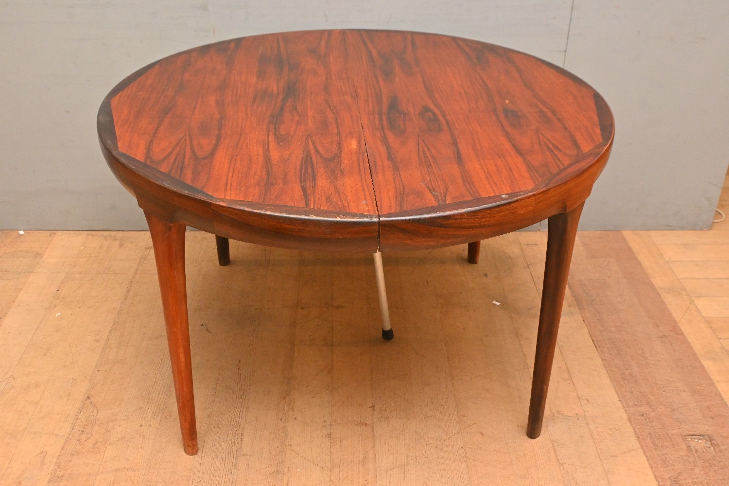 A DANISH ROSEWOOD ROUND DINING TABLE (A/F) (73H X 120D CM) (PLEASE NOTE THIS HEAVY ITEM MUST BE REMOVED BY CARRIERS AT THE CUSTOMER'S EXPENSE. LEONARD JOEL STAFF CANNOT ASSIST CARRYING THIS ITEM) (LARGE ITEM)