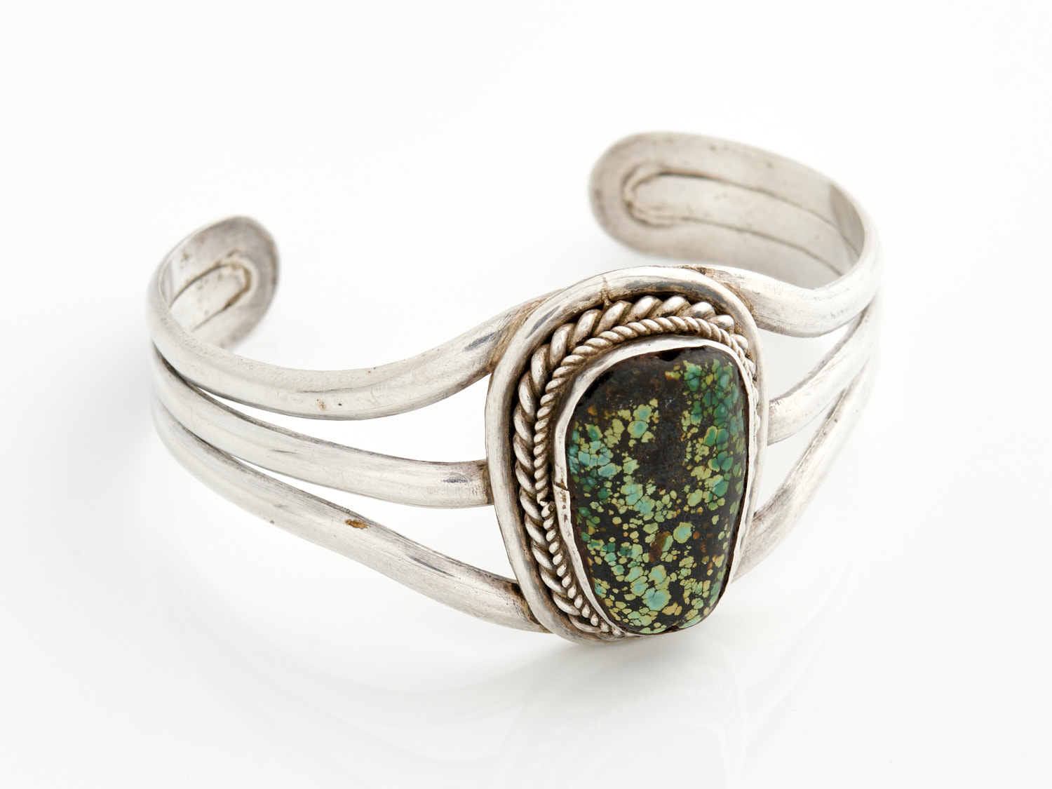 A TURQUOISE CUFF BANGLE IN STERLING SILVER, 62MM DIAMETER
