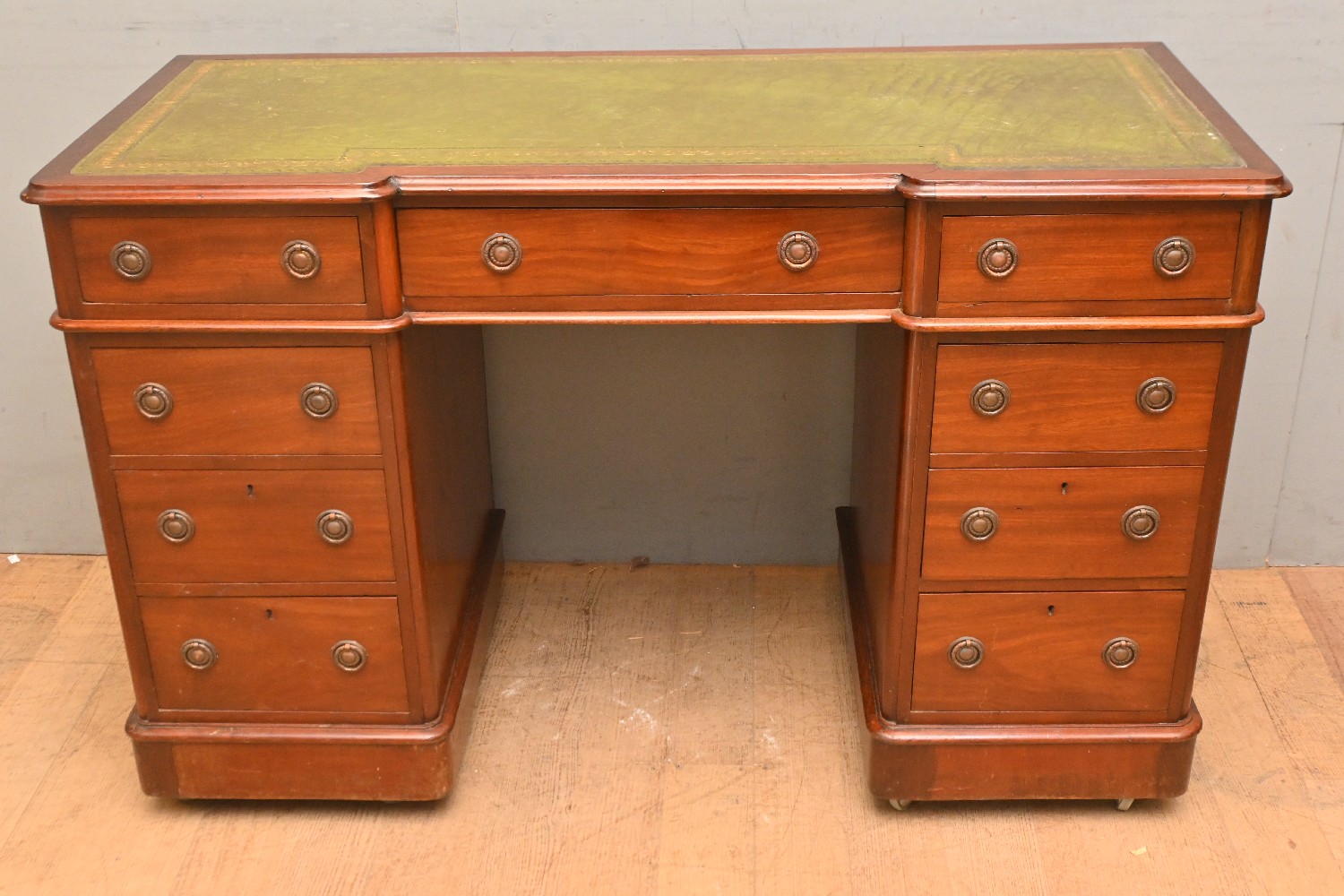 A SMALL VICTORIAN MAHOGANY PEDESTAL DESK, MOULDED INVERTED BREAK FRONT TOP WITH GREEN TOOLED LEATHER, 9 DRAWERS, PLINTH BASE.
