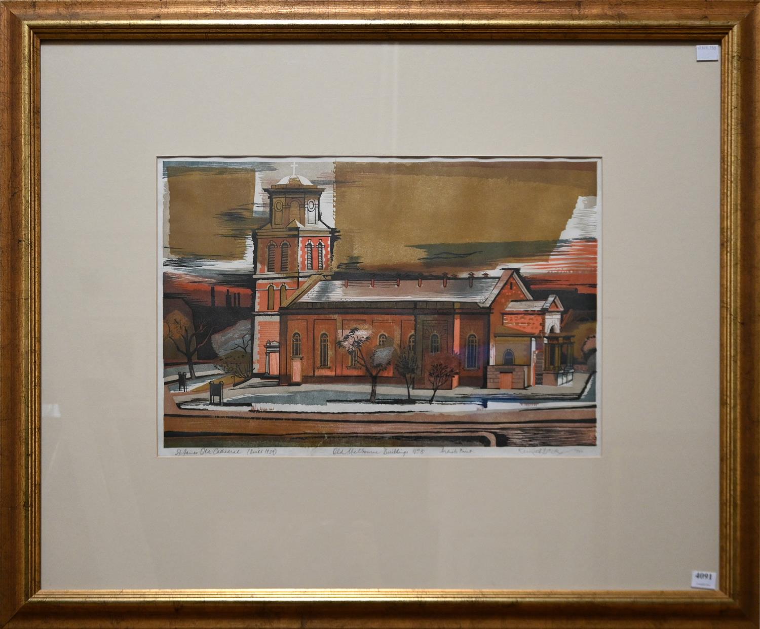 KENNETH JACK, OLD MELBOURNE BUILDINGS NO. 5 - ST. JAMES OLD CATHEDRAL (BUILT 1839) 1962, LINOCUT ED. A/P, SIGNED, TITLED, DATED AND EDITIONED BELOW IMAGE, 30 X 45.5CM, FRAME SIZE: 67 X 80CM