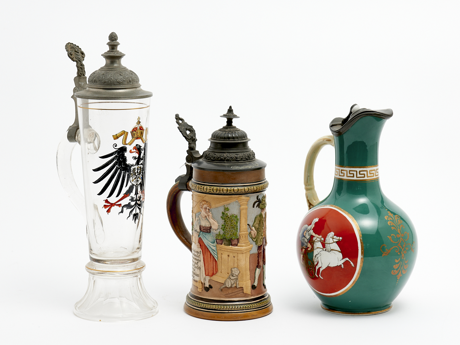 TWO GERMAN PEWTER LIDDED STEINS TOGETHER WITH A PRATT LIDDED JUG, H.32CM (TALLEST) LEONARD JOEL DELIVERY SIZE: SMALL
