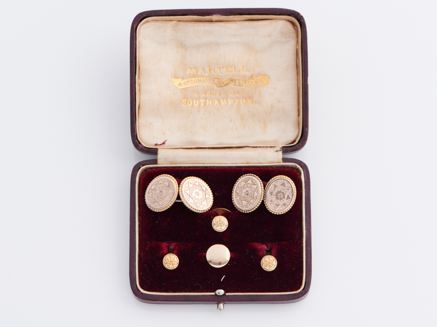 A SET OF EDWARDIAN CUFFLINKS AND SHIRT STUDS IN GOLD LINED METAL