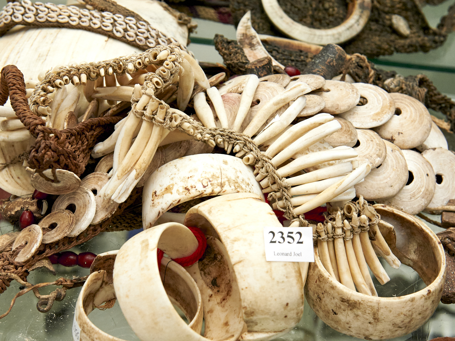 A COLECTION OF PAPUA NEW GUINNEA ITEMS INCLUDING TWO SACHELS, WITCH DOCTOR'S NECKLACE, SIX SHELL BRACELETS AND TWO NECKLACES L.42CM (LARGEST), LEONARD JOEL DELIVERY SIZE: SMALL
