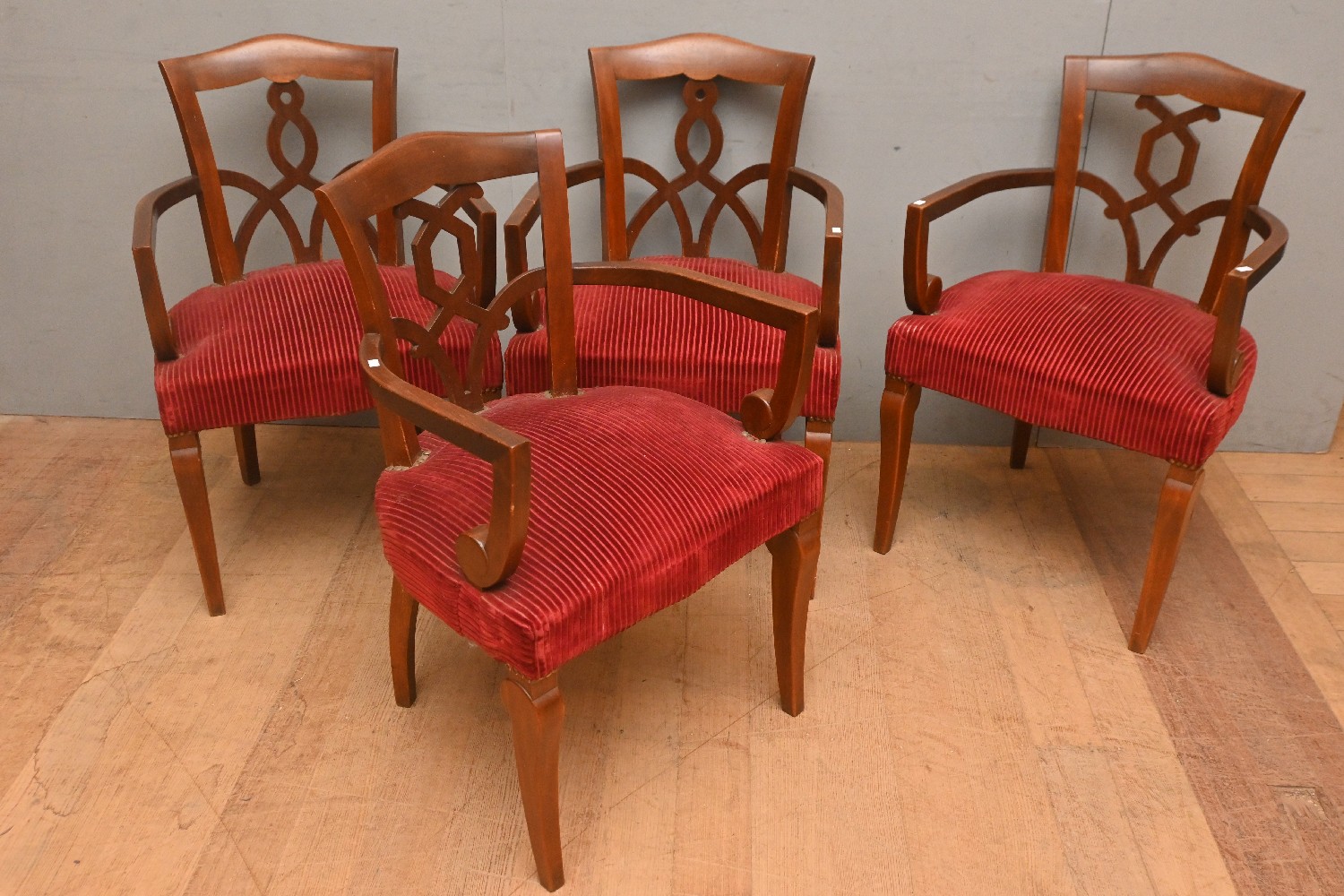 A SET OF FOUR FRENCH CHAIRS IN THE MANNER OF JULES LELEU (A/F) (86H X 55W X 52D CM) (LEONARD JOEL DELIVERY SIZE: X-LARGE)
