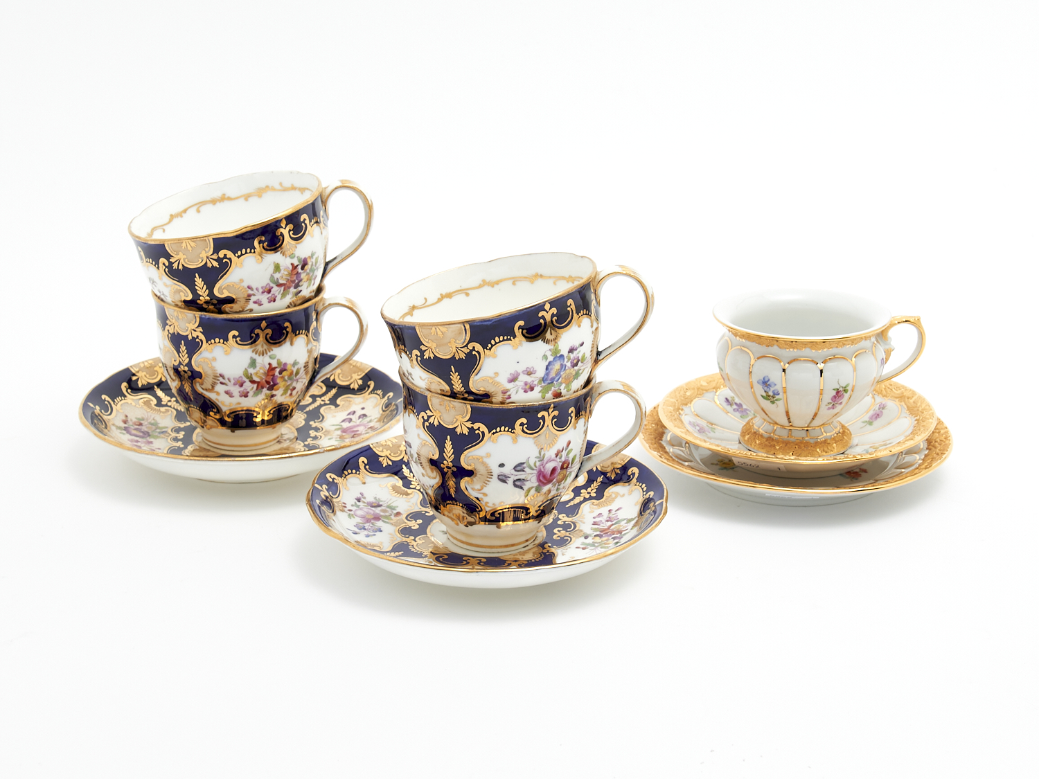 A GROUP OF PORCELAIN INLUDING A MEISSEN TRIO DIA.14CM (LARGEST), LEONARD JOEL DELIVERY SIZE: MEDIUM