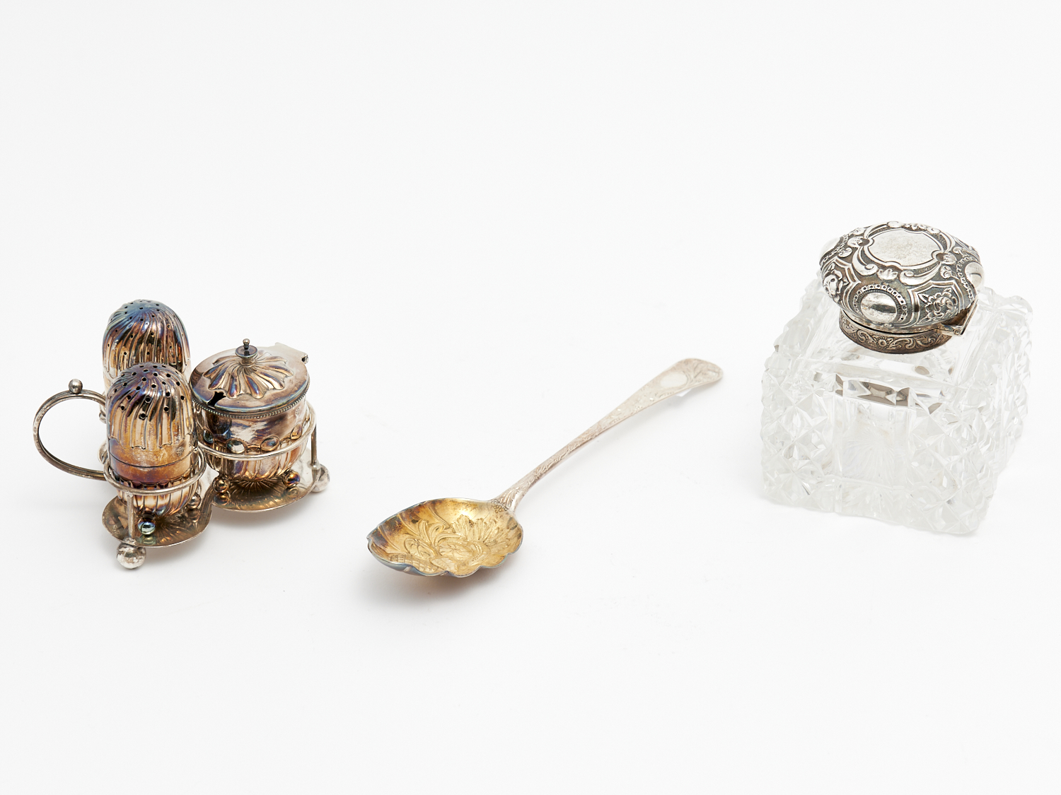 A TRIO OF STERLING SILVER CRUETS ON STAND TOGETHER WITH A GILDED STERLING SILVER BERRY SPOON AND A STERLING SILVER MOUNTED CUT CRYSTAL BOTTLE 290G (EXCLUDING BOTTLE) H.10.5CM, LEONARD JOEL DELIVERY SIZE: SMALL