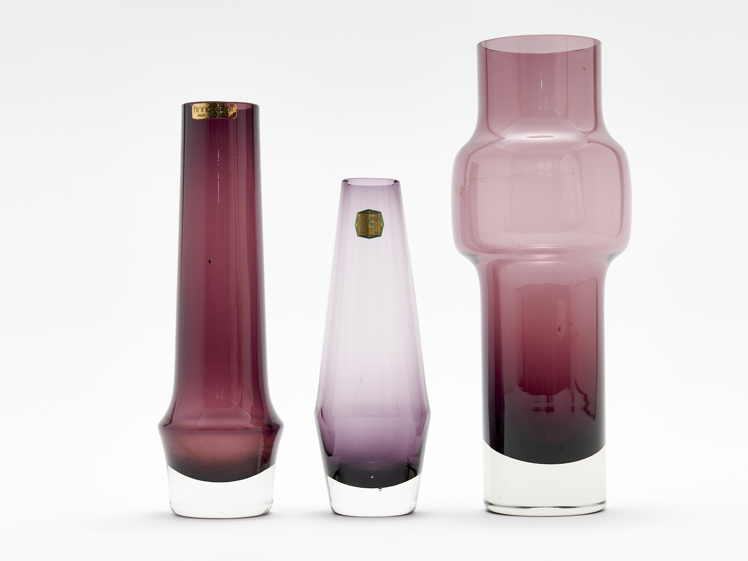 THREE VINTAGE PURPLE ART GLASS VASES INCLUDING A FINNISH EXAMPLE, TWO WITH ORIGINAL STICKERS H.25CM, LEONARD JOEL DELIVERY SIZE: MEDIUM
