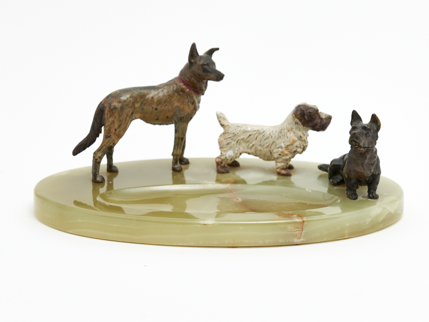 A VINTAGE OVOID ONYX DISH WITH A TRIO OF COLD-PAINTED BRONZE DOGS L.24.5CM, LEONARD JOEL DELIVERY SIZE: SMALL