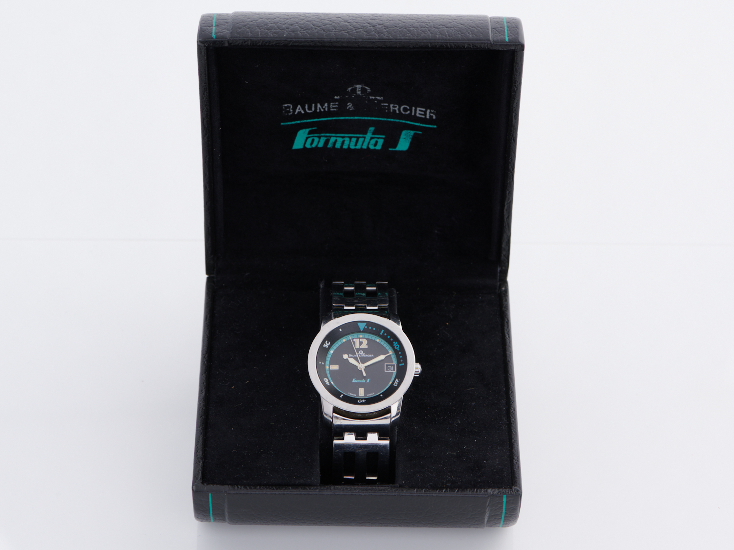 BAUME AND MERCIER, A FORMULA 1 WRISTWATCH IN STAINLESS STEEL, WITH DATE APPERTURE AT THREE, DIAL DIAMETER 33MM, BOXED