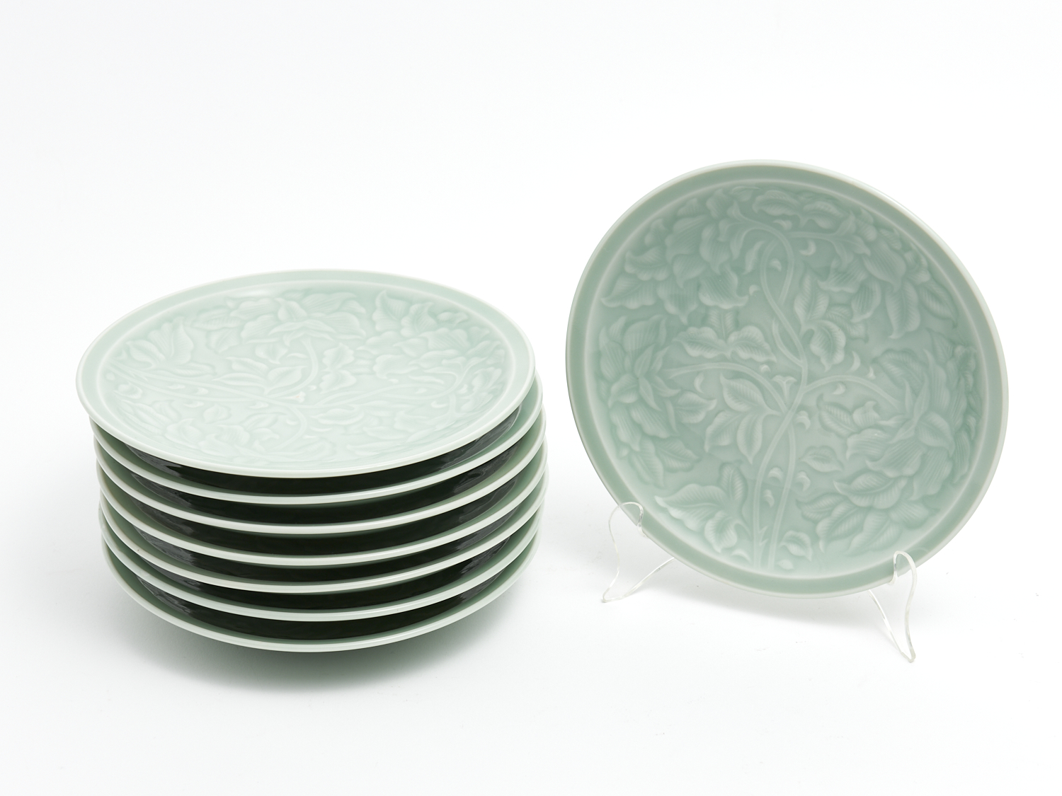 A SET OF EIGHT CHINESE CELADON GLAZED SIDE PLATES WITH FOLIATE DECORATION DIA.19CM, LEONARD JOEL DELIVERY SIZE: SMALL