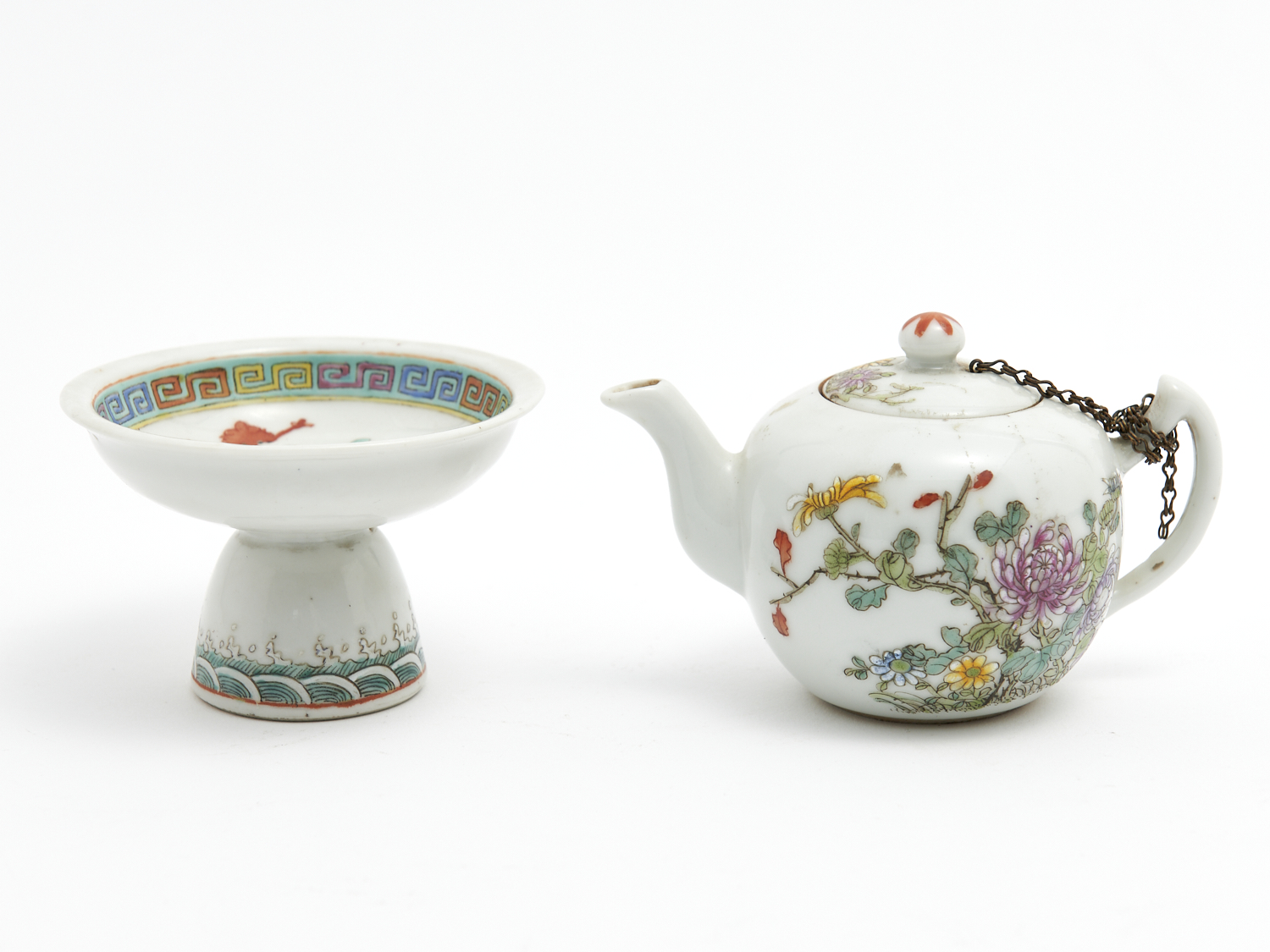 A SMALL CHINESE FAMILLE ROSE TEAPOT AND STEM CUP H.7.5CM (TALLEST), LEONARD JOEL DELIVERY SIZE: SMALL
