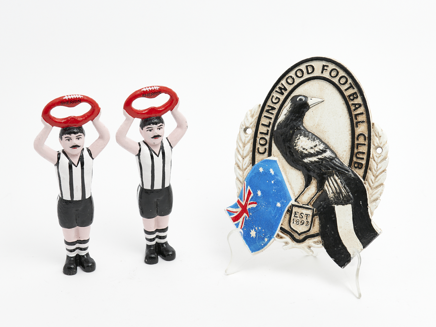 A GROUP OF COLLINGWOOD FOOTBALL CLUB CAST IRON OBJECTS INCL. A PLAQUE AND TWO BOTTLE OPENERS H.21CM, LEONARD JOEL DELIVERY SIZE: SMALL