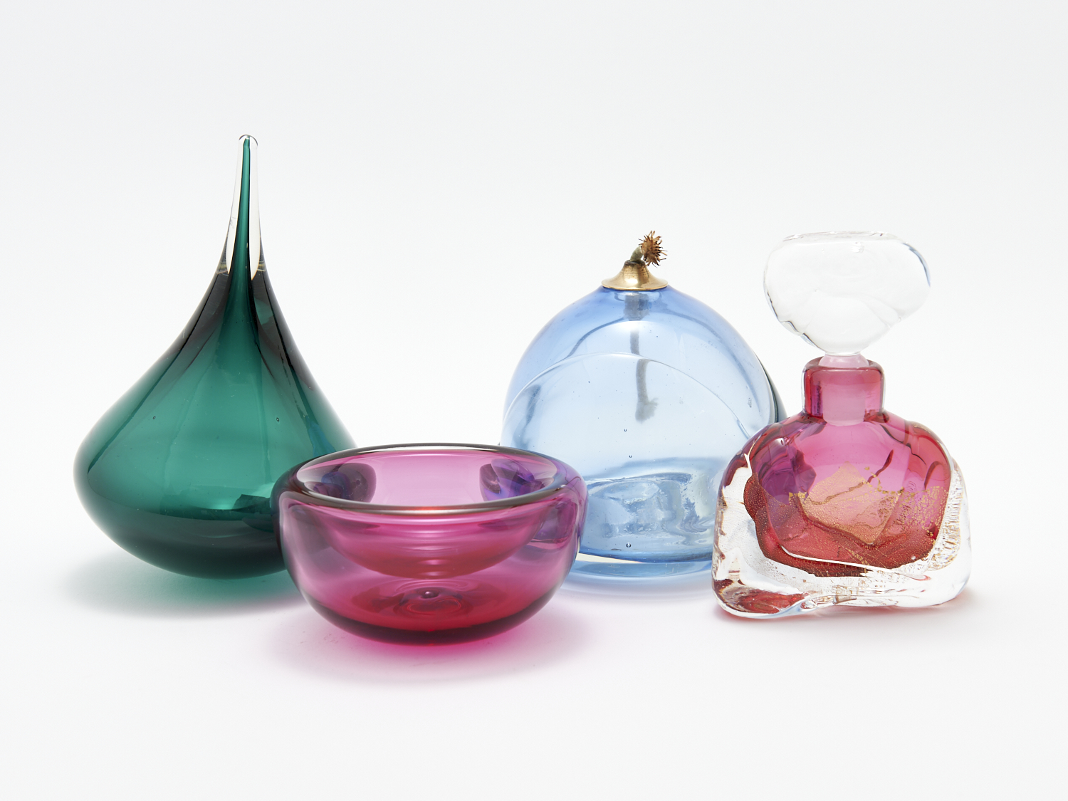 AN AUSTRALIAN ART GLASS COLLECTION WITH 'LUCKY DROP' BY LLEWELYN ASH, 'SAUCY DISH' BY LAUREL KOHUT, VESSEL BY JANEEN TONER, AND LAMP BY LISA WHYTE H.12CM, LEONARD JOEL DELIVERY SIZE: SMALL