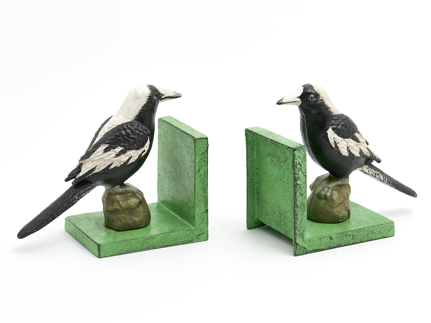 A PAIR OF CAST IRON MAGPIE BOOKENDS H.16.5CM, LEONARD JOEL DELIVERY SIZE: SMALL