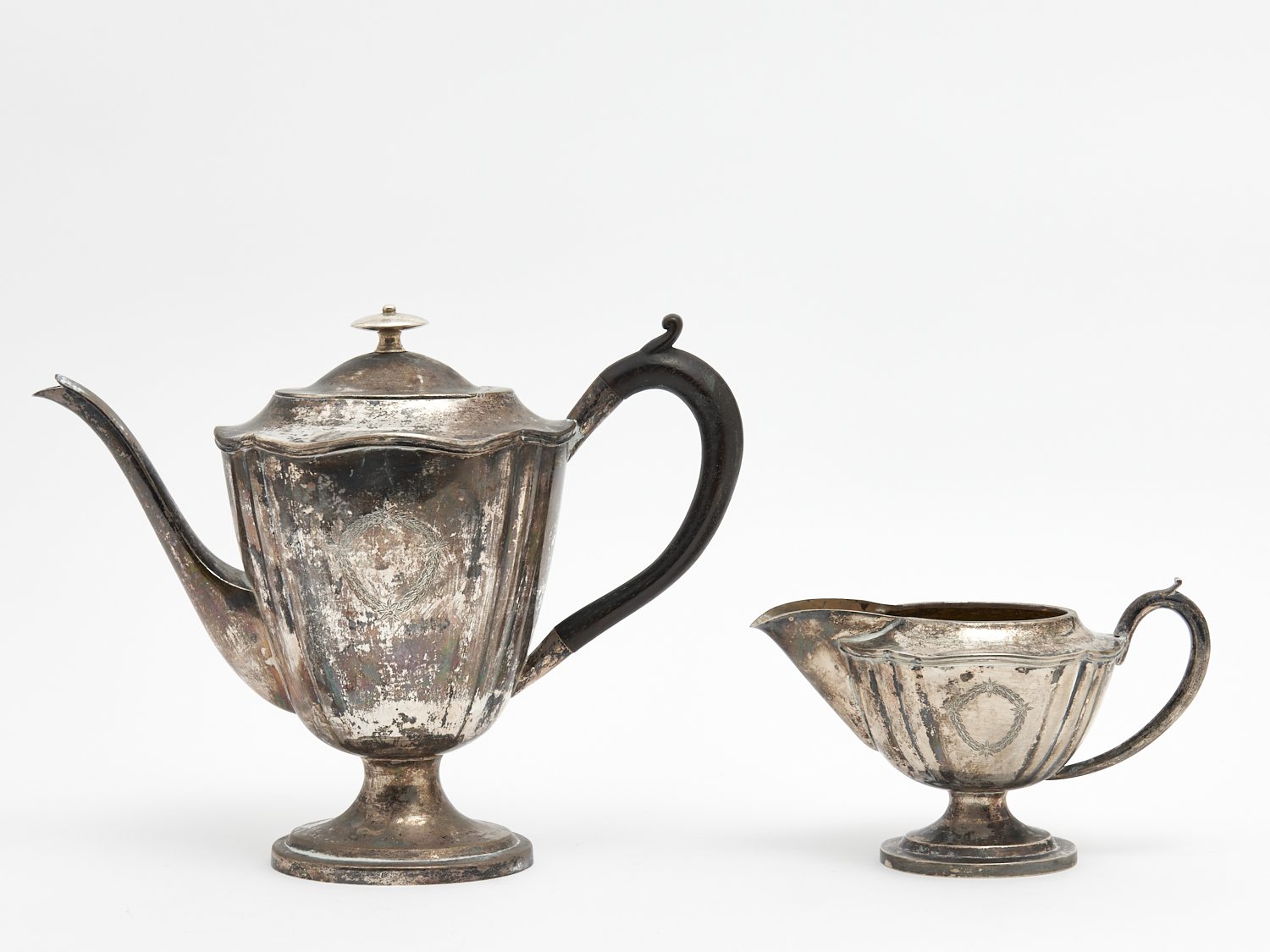 A CHINESE EXPORT FOOTED TEA POT AND CREAMER, WING NAM, HONG KONG, TOTAL WEIGHT 766G, H.21CM, LEONARD JOEL DELIVERY SIZE: SMALL