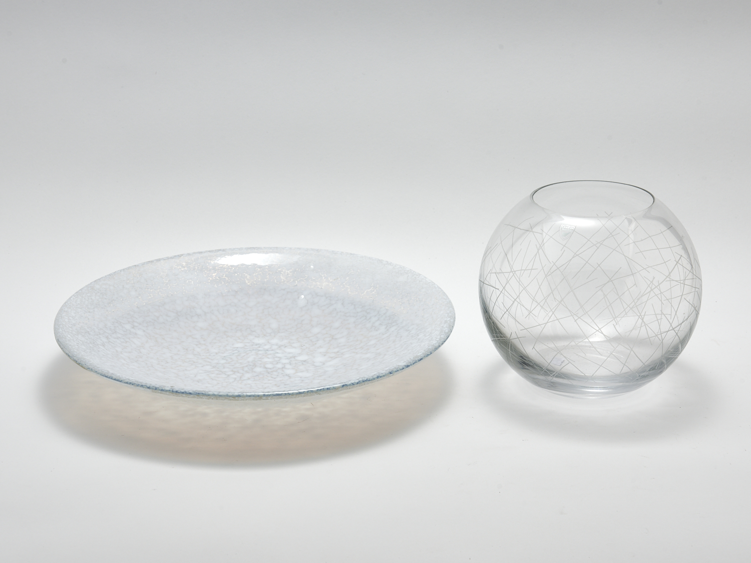 A LARGE 'TELLUS' ART GLASS PLATTER BY ANNA EHRNER FOR KOSTA BODA WITH A LARGE 'CONFUSION' VASE BY MAGNUS FORTHMEIIER FOR ORREFORS DIA.36CM (PLATTER), LEONARD JOEL DELIVERY SIZE: SMALL