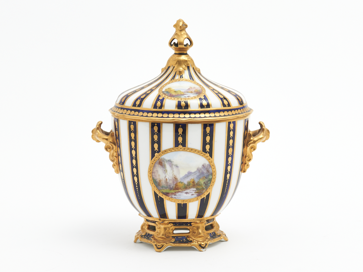 A VICTORIAN-STYLE CROWN DERBY PORCELAIN SUGAR BOX, WITH HAND-PAINTED LANDSCAPE SCENES TO THE BOX AND COVER H.17CM, LEONARD JOEL DELIVERY SIZE: SMALL