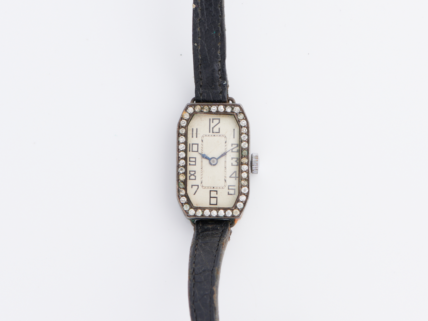 A LADY''S ART DECO WRISTWATCH IN SILVER, THE DIAL MEASURING APPROXIMATELY 27 X 17MM, TO LEATHER BANDS