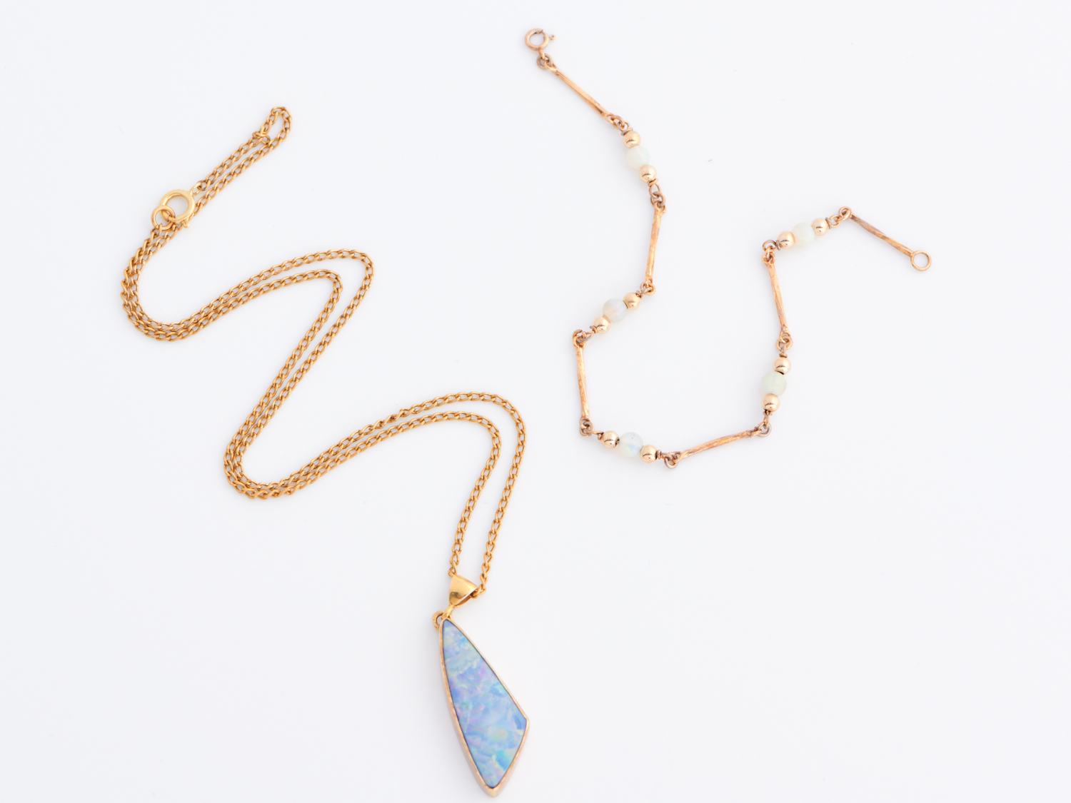 AN OPAL DOUBLET PENDANT AND CHAIN IN 9CT GOLD, TOGETHER WITH A OPAL BRACELET IN 9CT GOLD, 8.3GMS