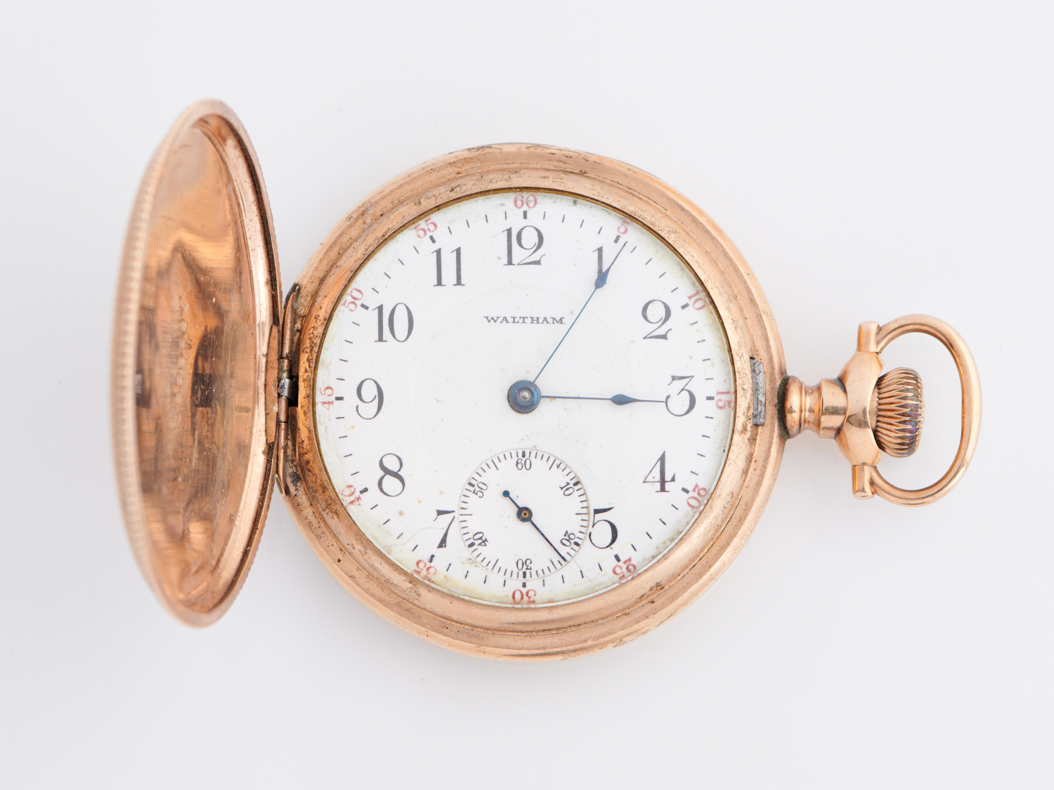 WALTHAM, A HUNTING CASED POCKETWATCH CASED IN ROLLED GOLD, DIAMETER 53MM