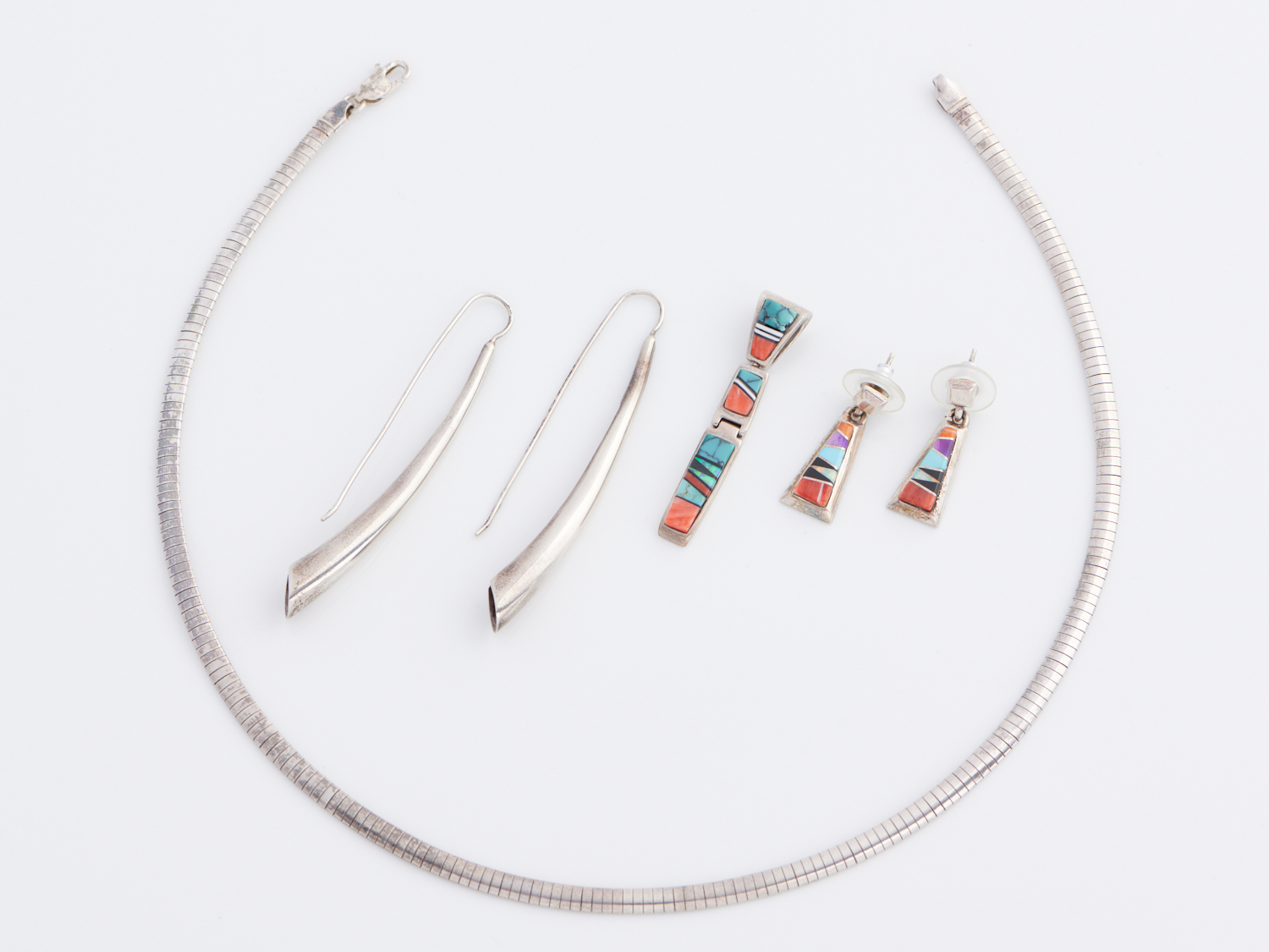 A GEM SET JEWELLERY SUITE IN SILVER, COMPRISING OF EARRINGS AND PENDANT NECKLACE TOGETHER WITH A PAIR OF MODERNIST EARRINGS IN STERLING SILVER