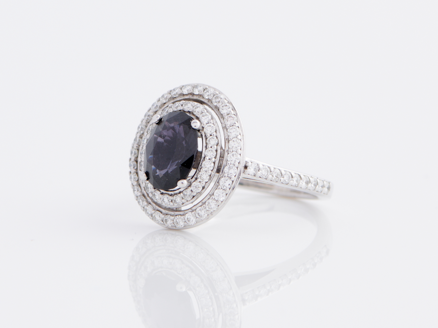 A SAPPHIRE AND DIAMOND RING IN 14CT WHITE GOLD, RING SIZE K