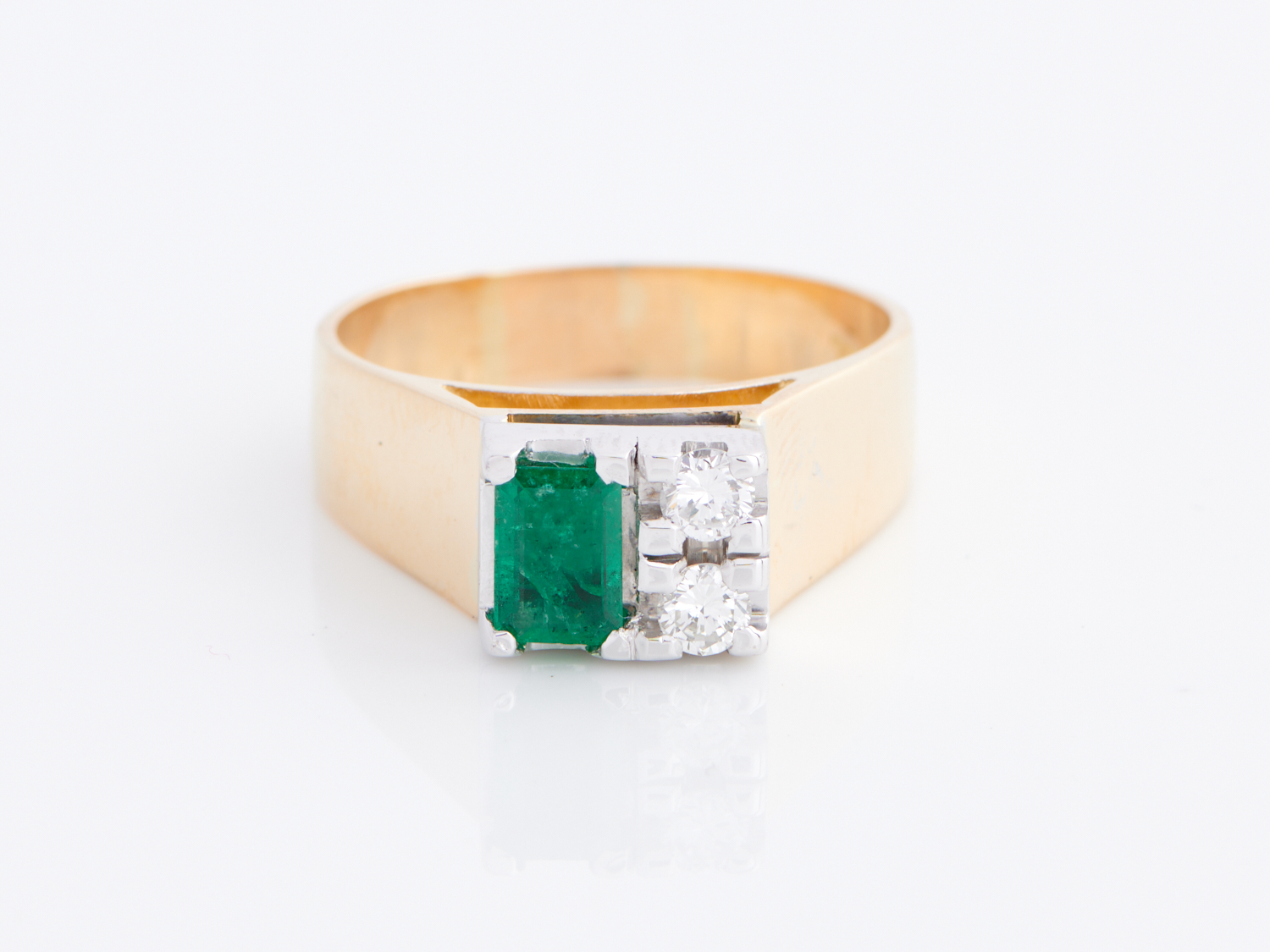AN EMERALD AND DIAMOND RING IN 18CT GOLD, SIZE R, 7.7GMS