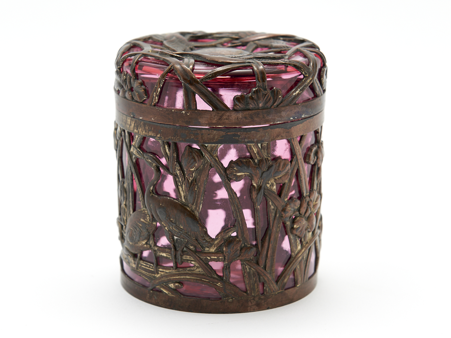 A JAPONOISE PEWTER OVERLAID CRANBERRY GLASS LIDDED JAR H.9.5CM, LEONARD JOEL DELIVERY SIZE: SMALL