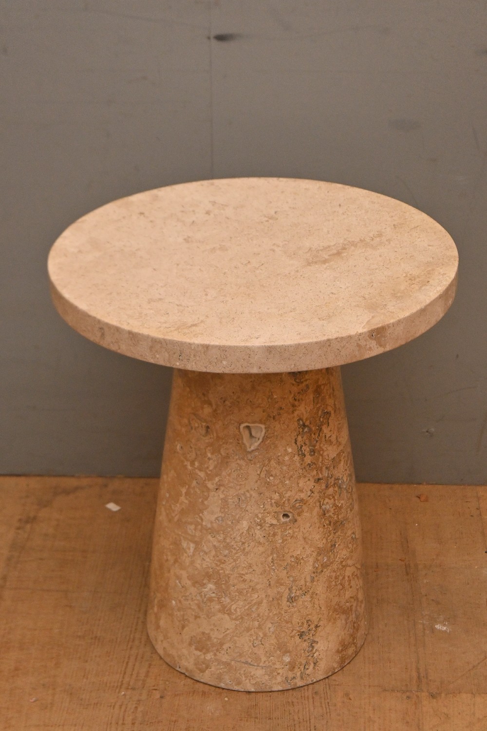 A SOLID TRAVERTINE ACCENT TABLE (51H X 45D CM) (PLEASE NOTE THIS HEAVY ITEM MUST BE REMOVED BY CARRIERS AT THE CUSTOMER'S EXPENSE. LEONARD JOEL STAFF CANNOT ASSIST CARRYING THIS ITEM) (LARGE ITEM)