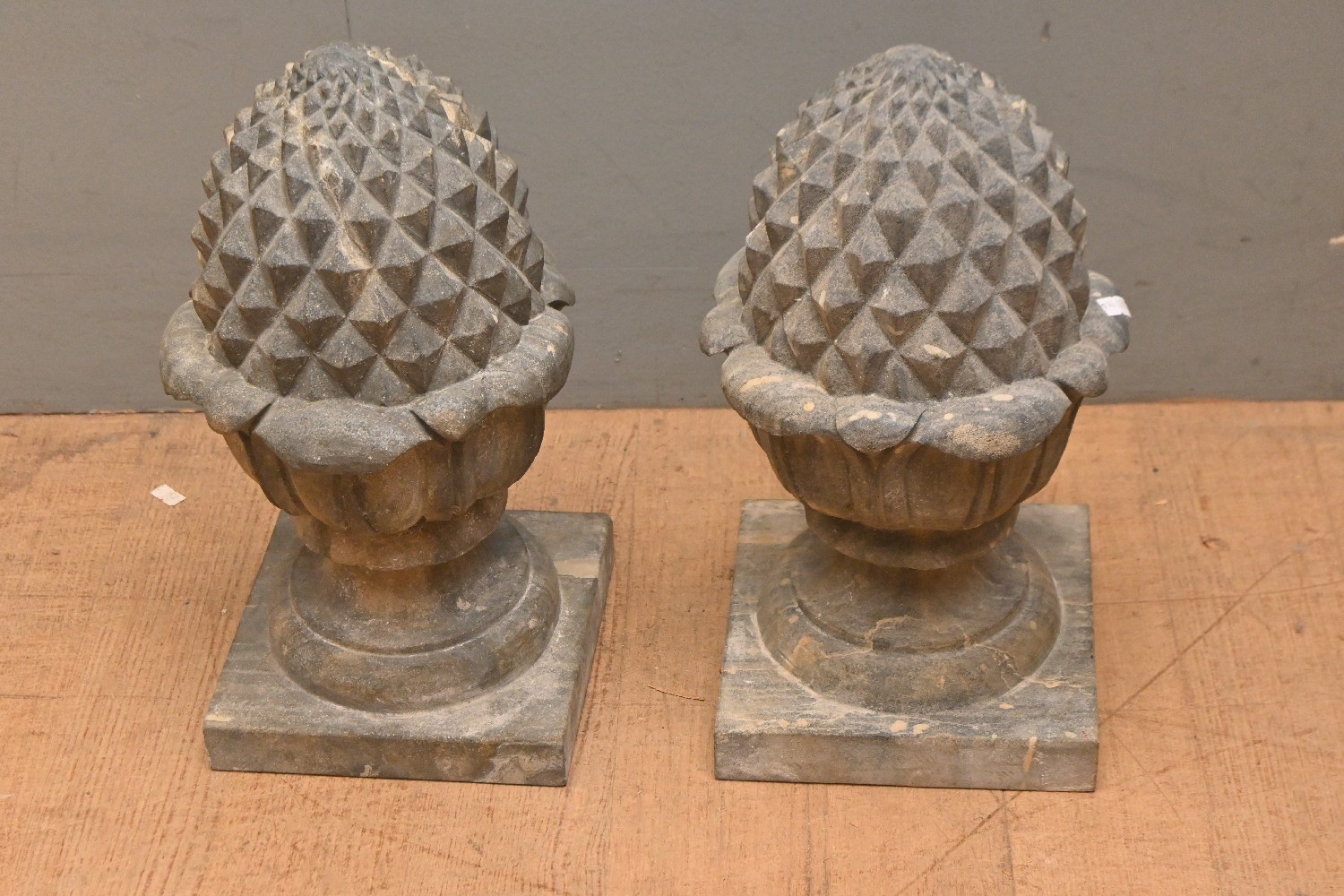 A PAIR OF HAND CARVED STONE FINIALS (43H X 20W X 20D CM) (PLEASE NOTE THIS HEAVY ITEM MUST BE REMOVED BY CARRIERS AT THE CUSTOMER'S EXPENSE. LEONARD JOEL STAFF CANNOT ASSIST CARRYING THIS ITEM) (LARGE ITEM)