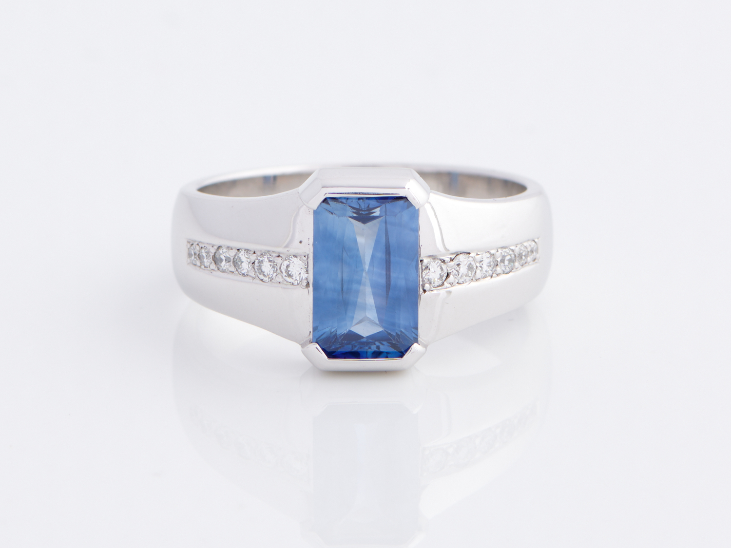 A SAPPHIRE AND DIAMOND RING IN 18CT WHITE GOLD, THE SAPPHIRE WEIGHING APPROXIMATELY 3.04CTS, WEIGHT 14.67GMS