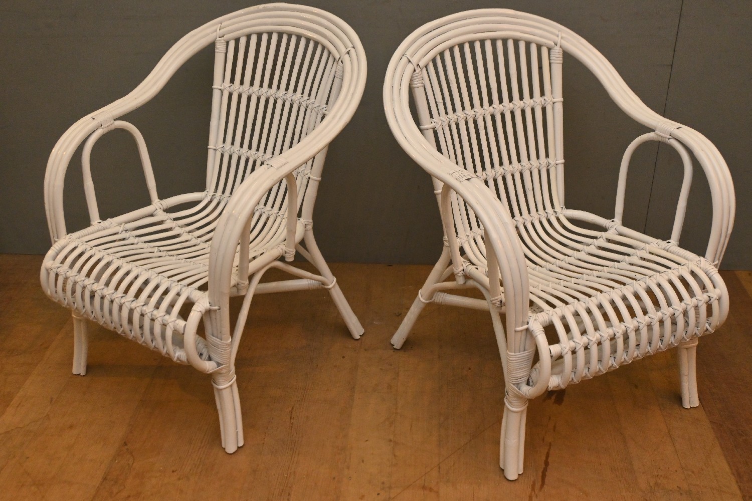 A PAIR OF WHITE PAINTED WICKER CHAIRS (85H X 67W X 74D CM) (LEONARD JOEL DELIVERY SIZE: LARGE)