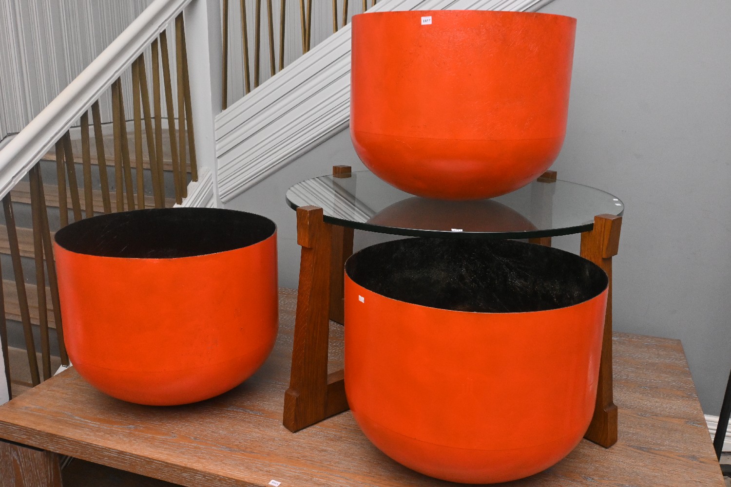 A SET OF THREE FIBERGLASS PLANTERS (50H X 61DIA CM) (LEONARD JOEL DELIVERY SIZE: X-LARGE)