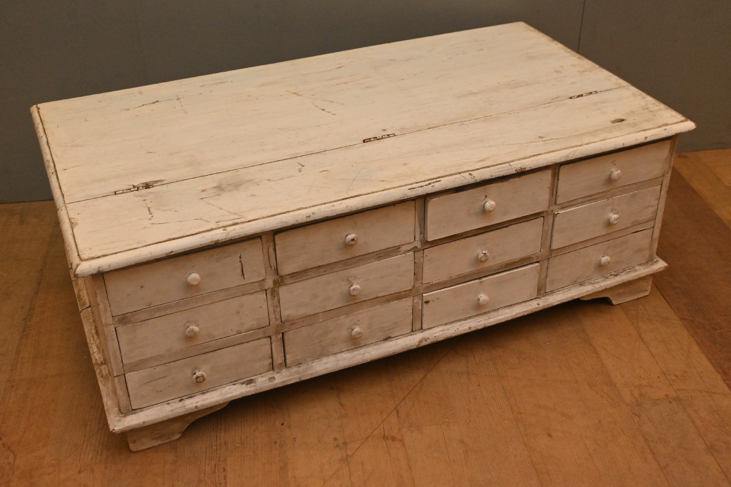 A RETRO PAINTED COFFEE TABLE WITH TWELVE DRAWERS (A/F) (43H X 116W X 64D CM) (PLEASE NOTE THIS HEAVY ITEM MUST BE REMOVED BY CARRIERS AT THE CUSTOMER'S EXPENSE. LEONARD JOEL STAFF CANNOT ASSIST CARRYING THIS ITEM) (LARGE ITEM)
