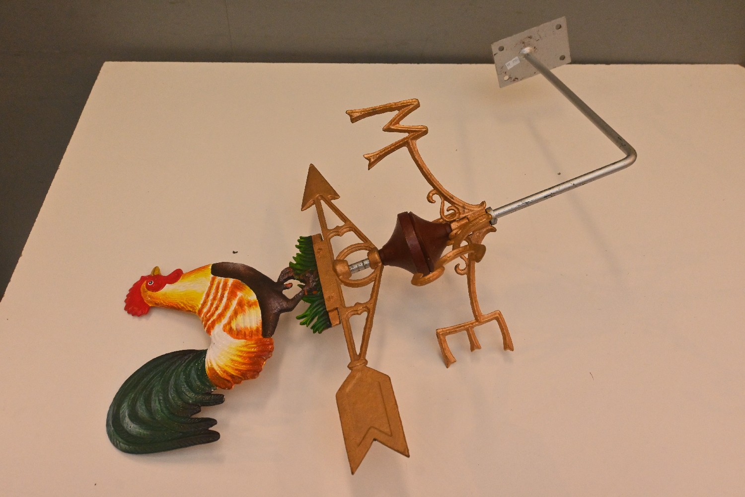 A CAST METAL WALL MOUNTED ROOSTER TOPPED WEATHER VANE (70H X 61W CM) (LEONARD JOEL DELIVERY SIZE: MEDIUM)