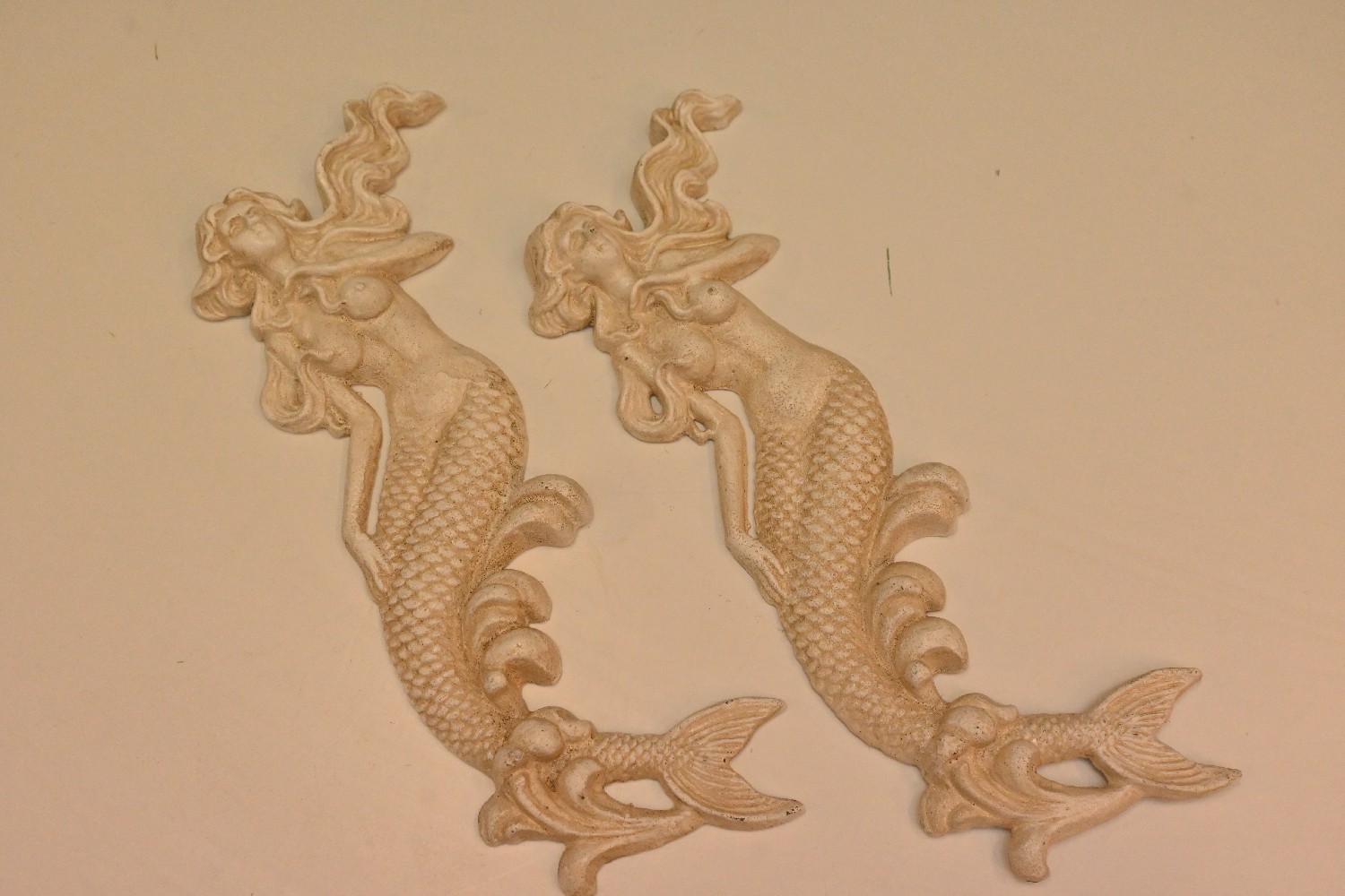 A PAIR OF CAST METAL MERMAID WALL PLAQUES (40H CM) (LEONARD JOEL DELIVERY SIZE: MEDIUM)