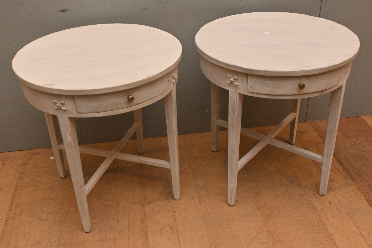 A PAIR OF GUSTAVIAN FRENCH GREY PAINTED SIDE TABLES (60H X 57D CM) (LEONARD JOEL DELIVERY SIZE: X-LARGE)