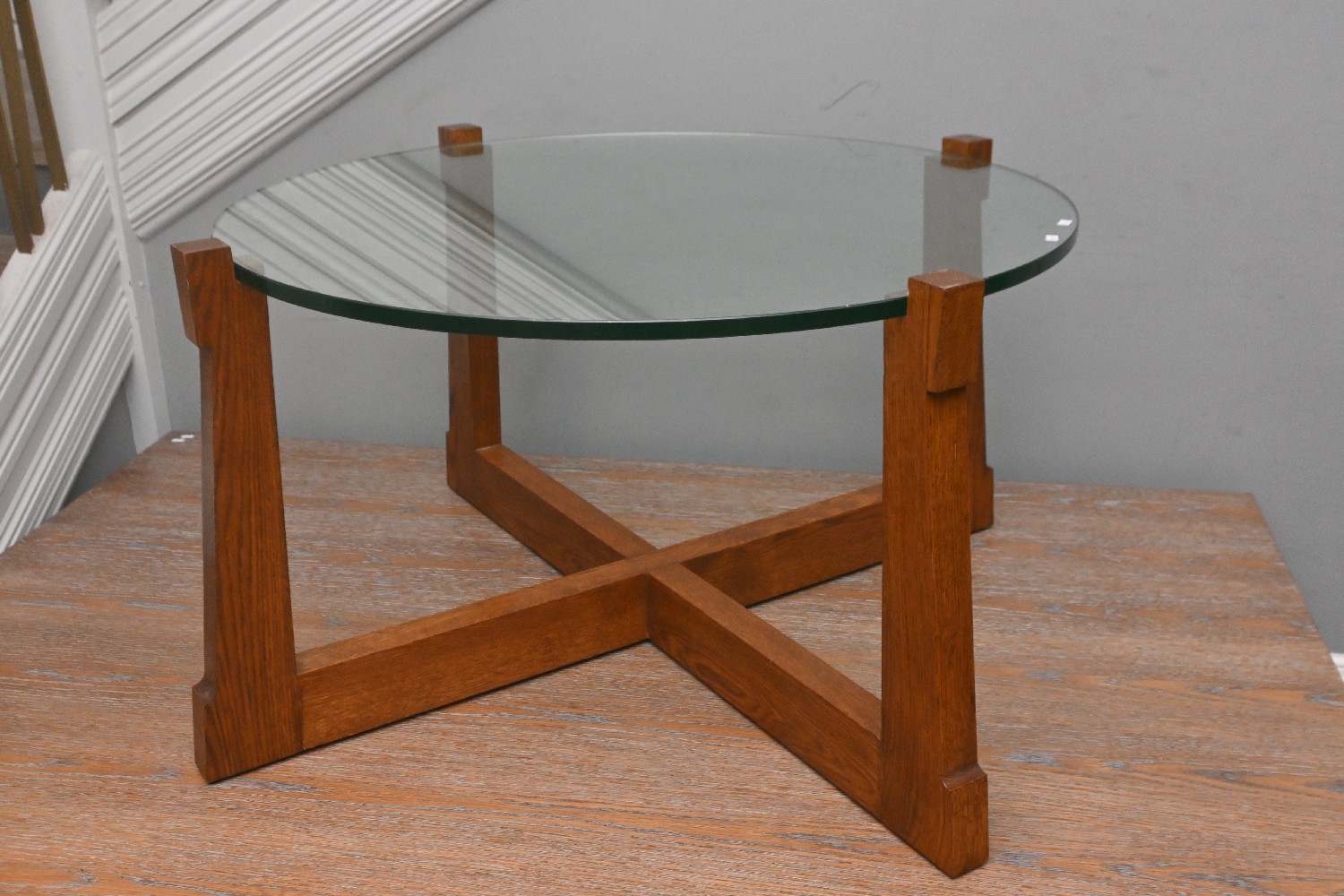 A CIRCULAR GLASS-TOPPED OAK TABLE, DESIGNED BY STUART RATTLE FOR MORTICE AND TENON (61H X 110DIA CM) (PLEASE NOTE THIS HEAVY ITEM MUST BE REMOVED BY CARRIERS AT THE CUSTOMER'S EXPENSE. LEONARD JOEL STAFF CANNOT ASSIST CARRYING THIS ITEM) (LARGE ITEM)