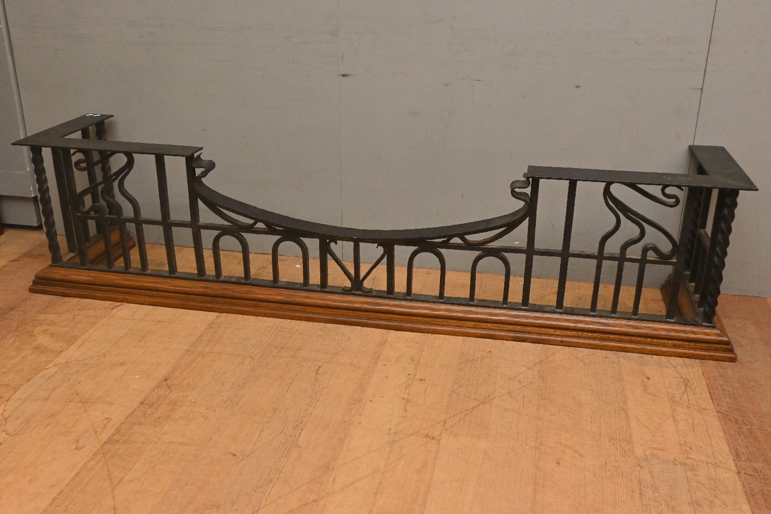 AN ARTS AND CRAFTS-STYLE WROUGHT AND OAK CLUB FENDER (A/F - LACKING SEATS TO TOP) (50H X 210W X 43D CM) (PLEASE NOTE THIS HEAVY ITEM MUST BE REMOVED BY CARRIERS AT THE CUSTOMER'S EXPENSE. LEONARD JOEL STAFF CANNOT ASSIST CARRYING THIS ITEM) (LARGE ITEM)